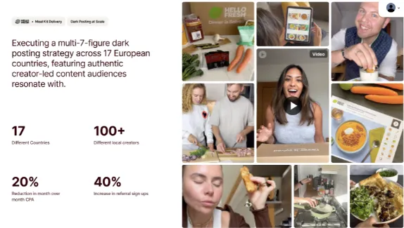 In our experience, this becomes even more powerful at scale. We collaborated with HelloFresh on a multi-seven-figure dark posting strategy across 17 European countries.